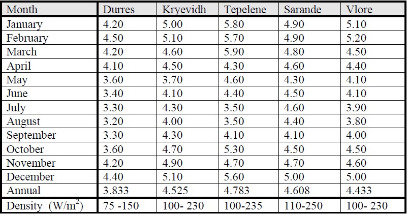 Consequently, the map showing the territory wind average speed (Figure 12) is a schematic map (there are no space gradients available). As a result, it shows only a number of regions characterized by high wind speed. Nevertheless, the main regions with high wind energy potentials are identified and they are: Shkoder (Velipoje, Cas), Lezhe (Ishull Shengjin, Tale, Balldre), Durres (Ishem, P.Romano), Fier (Karavasta, Hoxhara 1, Hoxhara 2), Vlore (Akerni), Tepelene, Kryevidh, Sarande.
